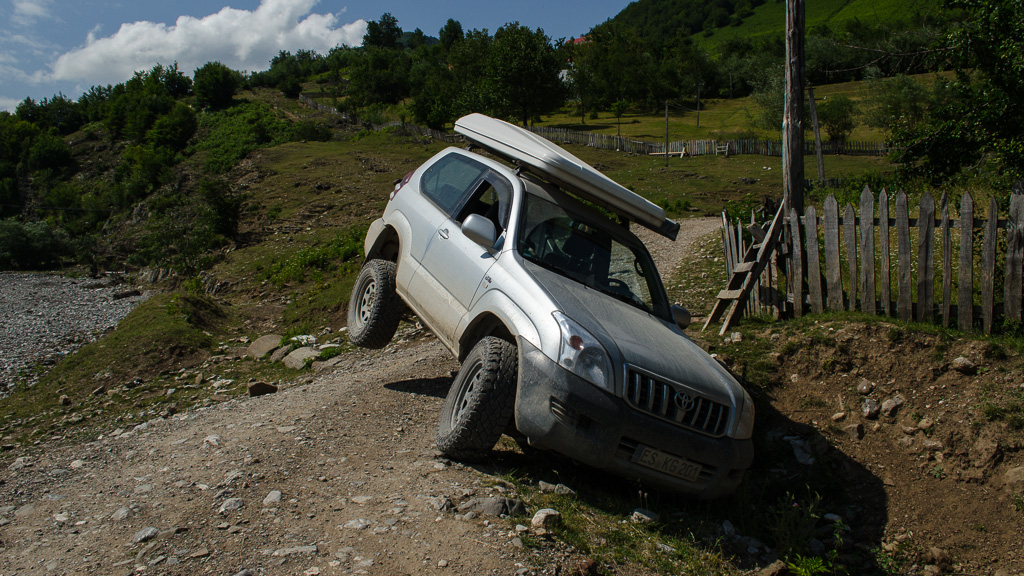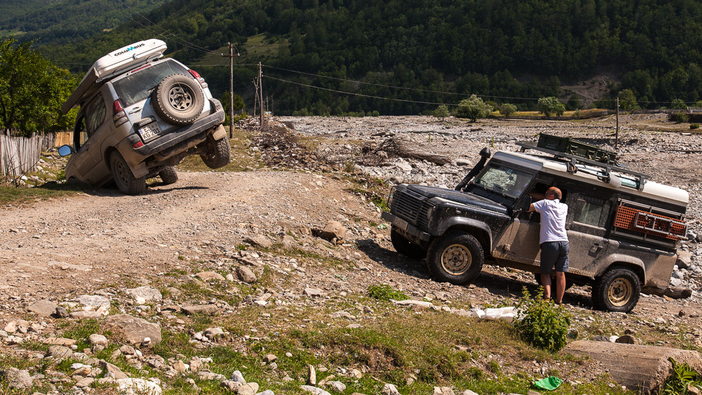 Markus fuhr den Defender auf die gegenüberliegende Flussseite um den Cruiser von hinten sichern zu können. So haben wir dann auch einen der wenigen englisch sprechenden Talbewohner kennen gelernt, der mich als erstes mit “Welcome to the Vermosh Valley” begrüßte um gleich danach zu bemerken, dass ich nicht der erste wäre, der in diesem Graben hängen würde 😉 .