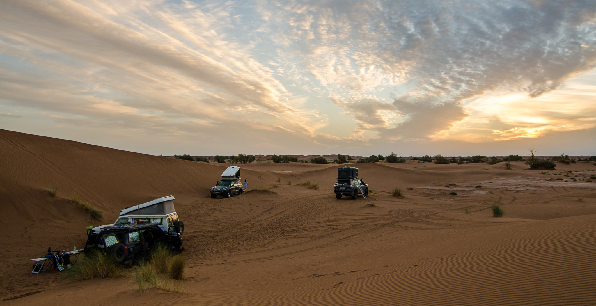 Zum Abschluss des Tages wollten wir alle noch mal in den Dünen übernachten, dass letzte Mal für diesen Urlaub. Am Rand des Ergs fand sich ein schönes Plätzchen neben einem der hier seltenen Bäume.