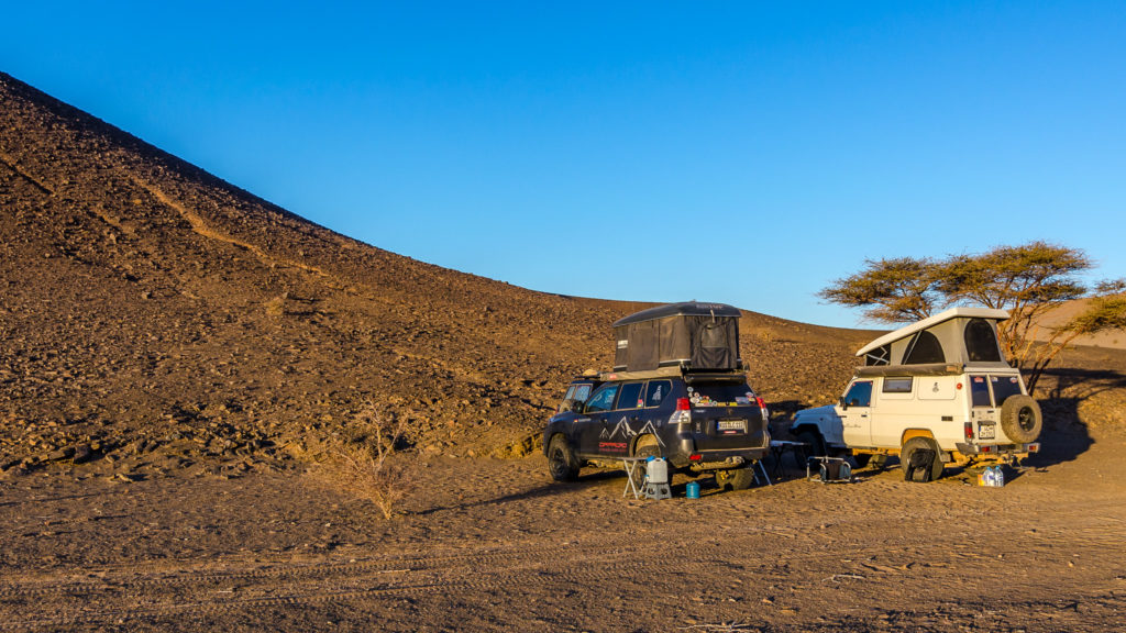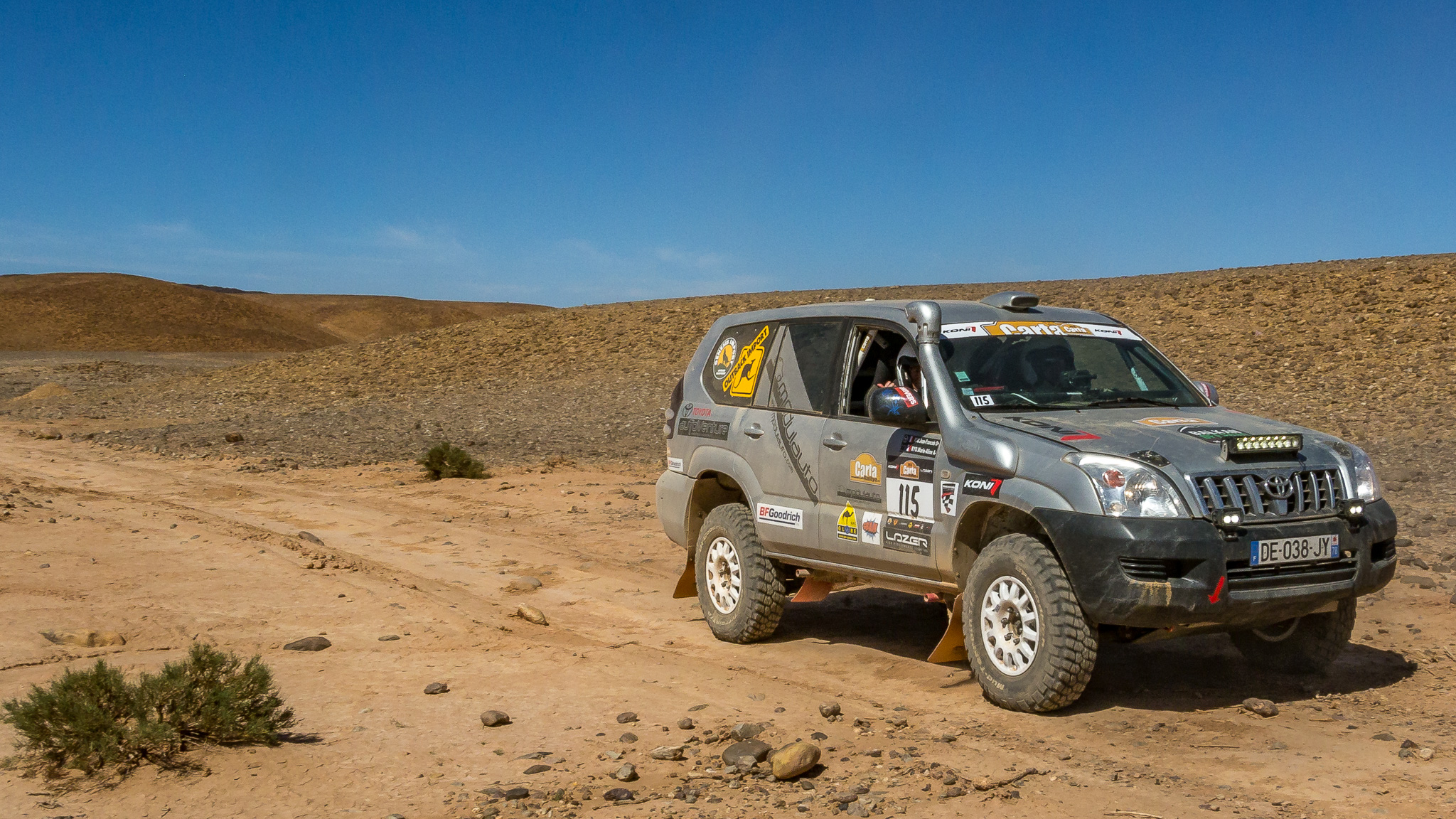 Die nächste Stunde werden wir zu Zuschauern, mitten im Nirgendwo. Das führt auch gleich beim ersten vorbeifahrenden Wagen zu Verwirrung, da er uns für eine Zeitkontrolle hält. Ein paar Fahrzeuge später könnten wir Benzin verkaufen, Tank leer gefahren. Er hat es noch genau bis zu uns geschafft, genau an der Kreuzung dann plopp – Motor aus. Konnte auch nicht mehr gestartet werden. Wenn es nicht fast 30km Piste bis Assa gewesen wäre, hätte ich ihm angeboten, ihn zur nächsten Tankstelle zu schleppen. Allerdings benötigen 30km Piste mit Fahrzeug im Schlepp locker zwei Stunden und nochmal eine um wieder zurück zu kommen. Da hier keine echte Notlage bestand, denn irgendwann wird ihn der Besenwagen abholen, haben wir seine Nachfrage mit dem Verweis, dass wir in die Gegenrichtung unterwegs sind abgelehnt.